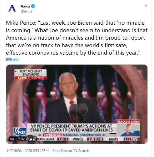 “美国是一个奇迹之国。”当地时间26日晚,美国副总统迈克·彭斯出席共和党全国代表大会并发表演讲,在谈到有关全美疫情问题时,他再将矛头指向民主党对手——前副总统乔·拜登,并喊话美国人称年底前有望研制出疫苗。而彭斯的“奇迹论”随即在社交媒体上引发网友嘲讽。