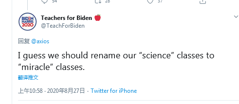 一名拜登的支持者则嘲讽说:“我想我们应该把我们的‘科学’课改名为‘奇迹’课。”↓