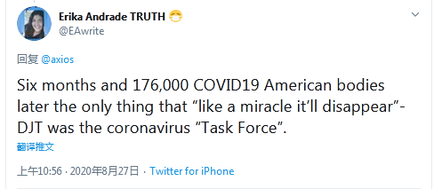 此外还有网友提及美国疫情严峻形势并表示不满:“6个月时间了,17.6万美国人死亡,唯一‘奇迹般消失’(注:特朗普语)的是(白宫)新冠疫情‘特别工作组’。”↓