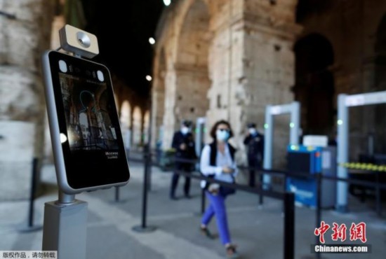 资料图:6月1日,意大利首都罗马,罗马斗兽场重新开放。出于防疫原因,参观者在入场时被要求戴上口罩、测量体温并进行手部消毒。