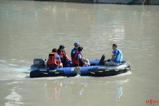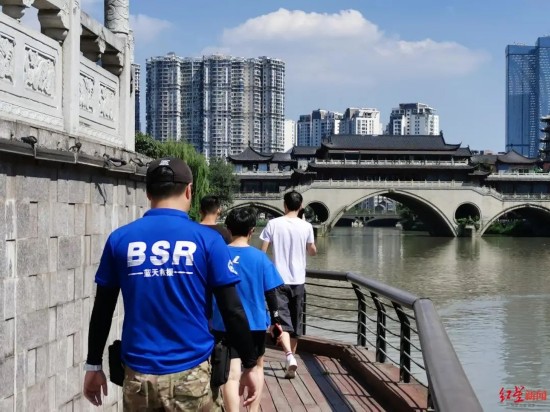26日下午3点,四川蓝天救援队来到合江亭,水井坊派出所一位负责人也来到现场——他领着蓝天救援队的队员到了陈勇军跳河救人的位置,在合江亭下面两河交汇处。救援队了解了近期水流、陈勇军最后冒头以及获救女子上岸位置等信息后,驾驶橡皮艇进入府南河,“我们要先用声呐寻找可能的位置。”