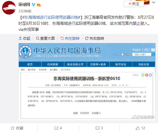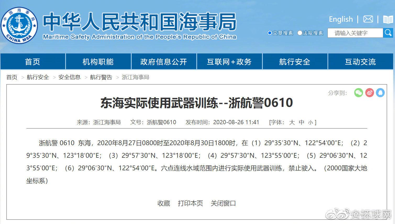 浙江海事局官网发布航行警告:8月27日8时至8月30日18时,东海海域进行实际使用武器训练,该水域范围内禁止驶入。