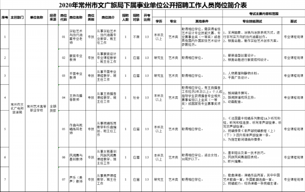 为更好地选拔优秀人才,充实人才队伍,优化人员结构,根据《江苏省事业单位公开招聘人员办法》(苏办发〔2020〕9号),常州市文广旅局下属事业单位常州艺术高等职业学校将面向社会公开招聘工作人员7名(进编)。