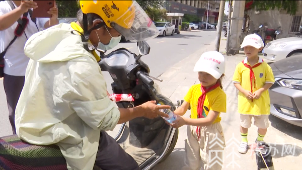 为了让更多市民了解“城市清凉侠”公益活动,孩子们还在知心奶奶的陪同下,冒着烈日走上街头,为附近的城管队员、社区网格员等户外一线工作者送上清凉。孩子们的爱心也换来了户外工作者们的点赞。