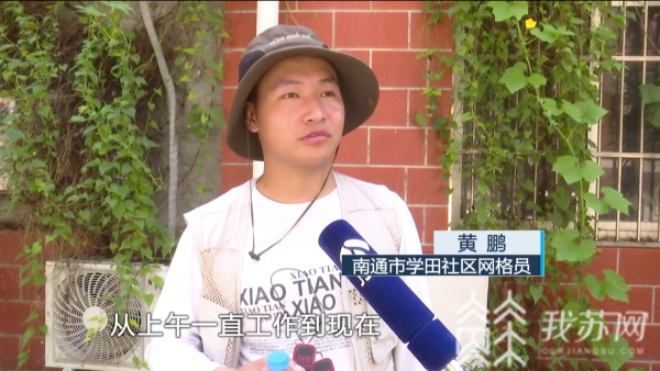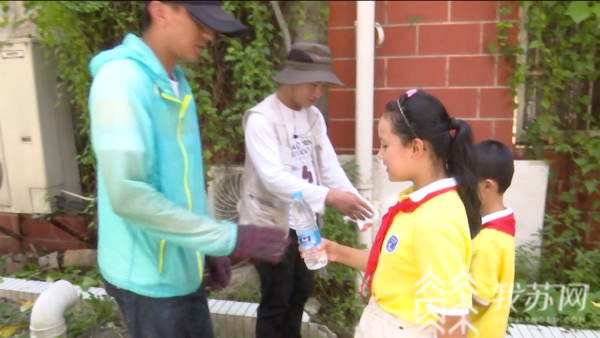 南通学田社区网格员黄鹏说,自己一整个上午都在户外工作,天气很热,喝到小朋友们给送的水,心里非常高兴。