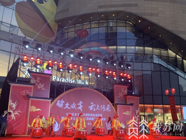 记者现场看到,广场四周,布置了融合传统文化、地方风情和乡村风味的文创集市,具有南京和江宁代表性的金陵云锦、金陵剪纸、金陵面塑、金陵纸鸢、金陵金箔和清真板鸭、洋槐蜂蜜、方山紫雾、禄口皮草等非遗项目和地方特产全面展出,吸引了大量市民驻足观赏。