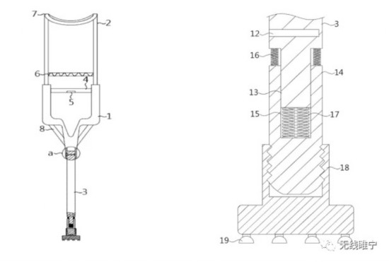 据了解,这种便携式防摔倒腋下拐杖,在支杆底部增加带吸盘的底座,有效增加了使用时的底座接触面积,使得在滑地面上患者使用时,不易打滑;同时设置多个弹簧进行缓冲作用,减小传递至拐上端与人体接触的震动作用力,增加了使用者的舒适感;将支杆通过连接架上滑孔收至固定杆上内部,再通过T形销进行固定,对拐杖不使用时进行折叠收缩,减小拐杖存放空间,便于携带。