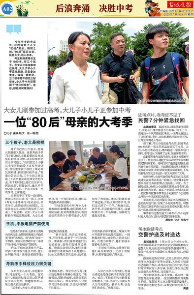 还记得今年中考期间,本报曾经报道的80后妈妈谢海云吗?今年大女儿参加高考,双胞胎儿子参加中考。日前记者获悉,谢海云的女儿陈雨琪以高考408分的成绩被南京大学录取,双胞胎儿子陈雨飞、陈雨翔分别以中考715分、714分被盐城中学录取。