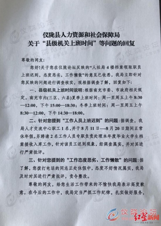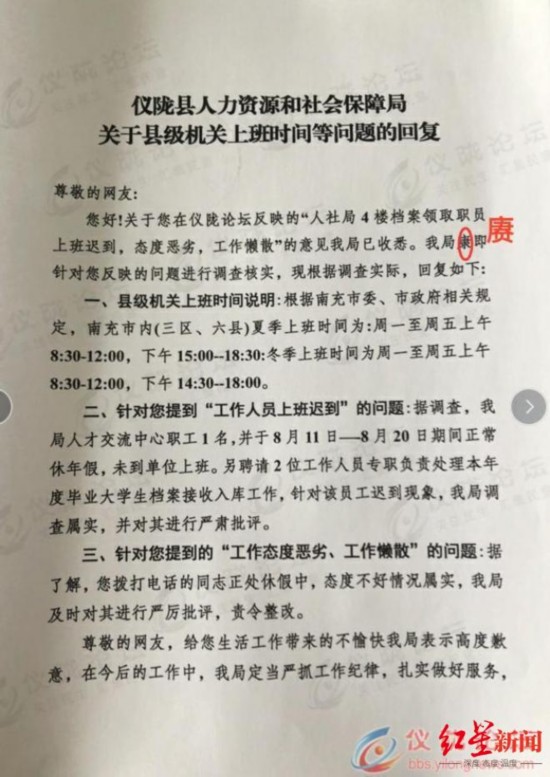8月20日,仪陇县人社局作出的一份盖有鲜章的官方回复称,据调查,我局人才交流中心职工1名,并于8月11日一8月20日期间正常休年假,未到单位上班。另聘请2位工作人员专职负责处理本年度毕业大学生档案接收入库工作,针对该员工迟到现象,我局调查属实,并对其进行严肃批评;您拨打电话的同志正处休假中,态度不好情况属实,我局及时对其进行严厉批评,责令整改。