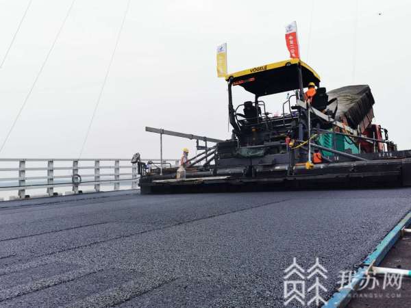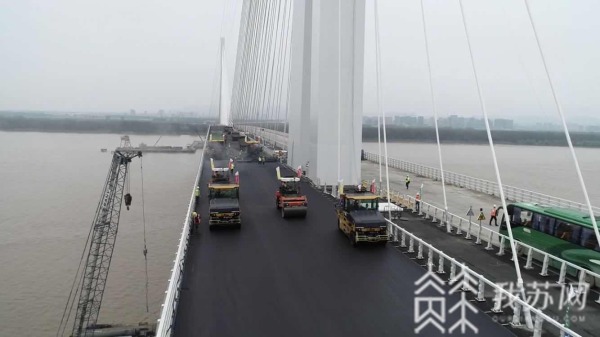 上午9:30,记者在南京长江五桥主桥面上看到,多名施工人员正在操作沥青摊铺机、轧路机等机械,正在紧张忙碌中。南京公建中心长江五桥项目现场负责人赖用满告诉记者,施工人员正在进行上游幅桥面下面层的沥青摊铺施工。“大概到9月下旬,我们将完成主桥上游幅和下游幅桥面的上面层施工。”