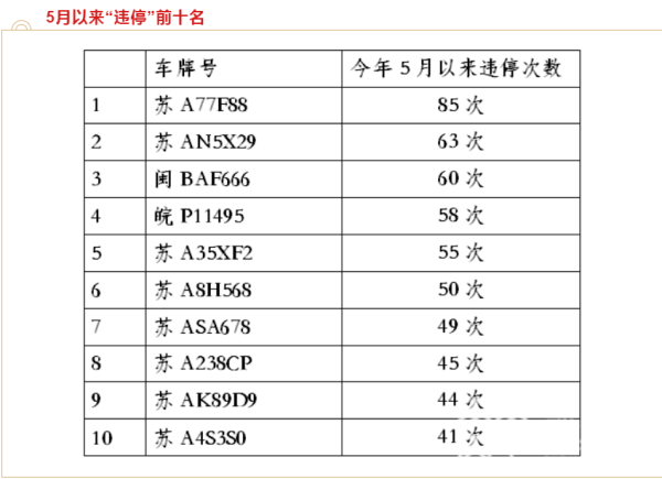 下图中这10辆车,今年5月以来,最少的违停41次,最多的违停85次!