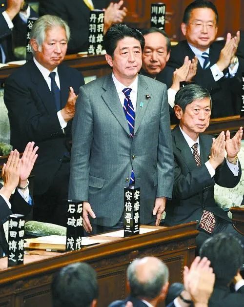 2012年12月,安倍晋三出任日本第96代首相,成为战后继吉田茂之后,第二位再度拜相的政治家。图为安倍晋三当选首相后接受国会议员们的祝贺