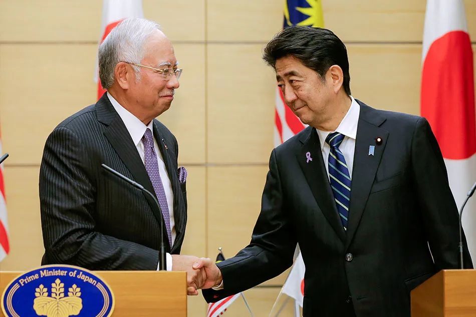 2014年5月22日,安倍晋三在官邸与时任马来西亚总理纳吉布(左)举行会谈,向对方推销了新干线技术