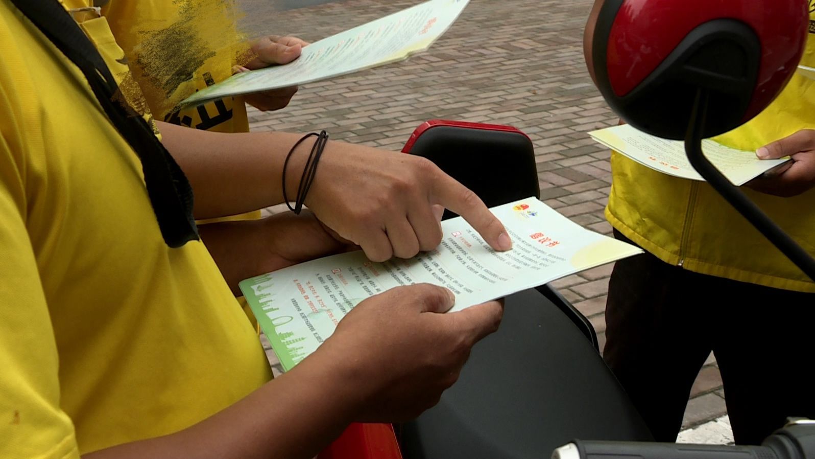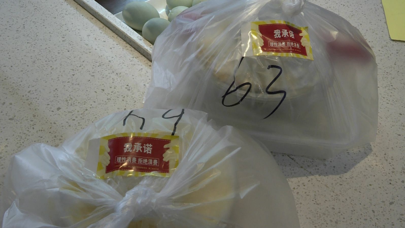 记者来到一处外卖小哥的早会现场,站点负责人正和外卖小哥讲解发放倡议书和张贴标签的一些注意事项。随后记者跟随外卖小哥前往几家餐饮店,他们每走进一家餐饮店取餐,便会将随身携带的倡议书分发给每家商户,倡导外卖餐饮商户从顾客的饮食习惯合理搭配食材,推出以供餐人数为标准的优惠套餐,引导消费者合理点餐。