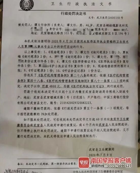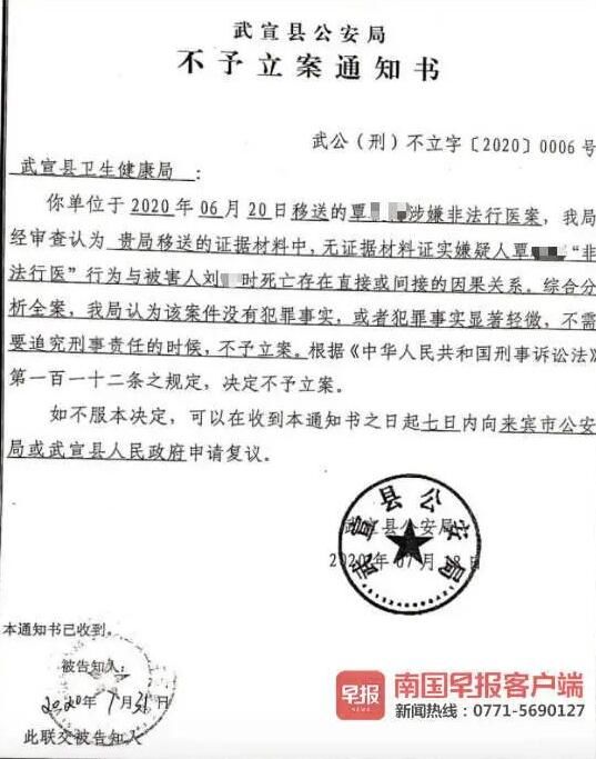 当地卫健部门介入后,于7月9日对事发诊所作出罚款4800元、吊销《医疗机构执业许可证》的行政处罚,并将覃某涉嫌非法行医的相关材料移交至武宣县公安局,希望追究其刑事责任。7月18日,武宣县公安局对此作出不予立案的决定。