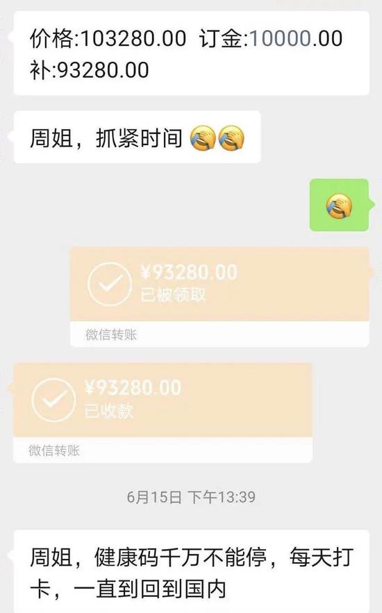 周女士的儿子在加拿大读本科,疫情暴发后,她担心儿子安全,一直在找渠道购买机票,让儿子回来。6月,她通过朋友推荐联系上了一位特价机票代理人,原价4万多的东方航空经济舱机票,最终以1万订金,10万多元的成交价格,在代理人手里买到了7月从温哥华直飞成都的机票。