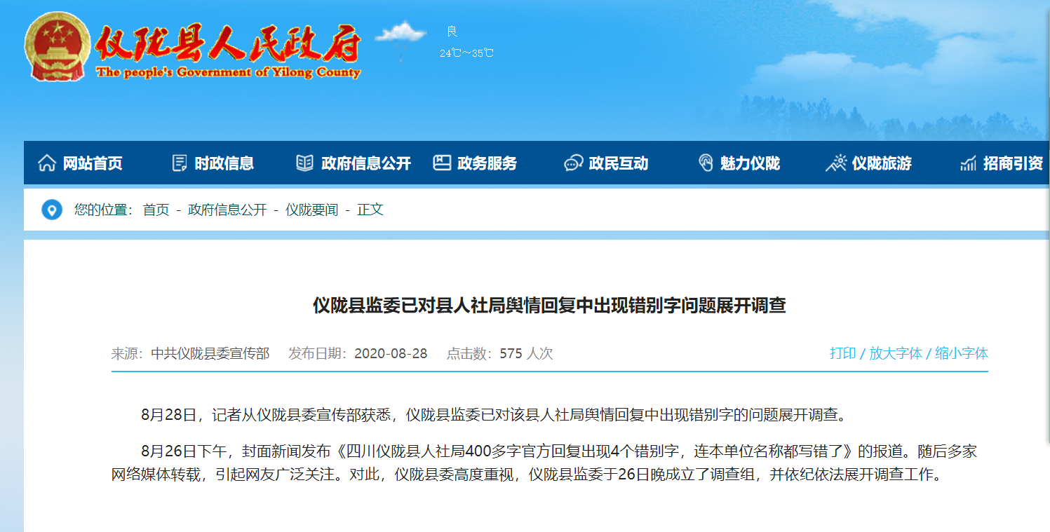 荔枝新闻讯 8月30日,就日前“仪陇县人社局400多字官方回复出现4个错别字,连本单位名都写错。”事件,南充市仪陇县人民政府新闻办公室发布通报,通报该事件经过、处理情况和整改措施。