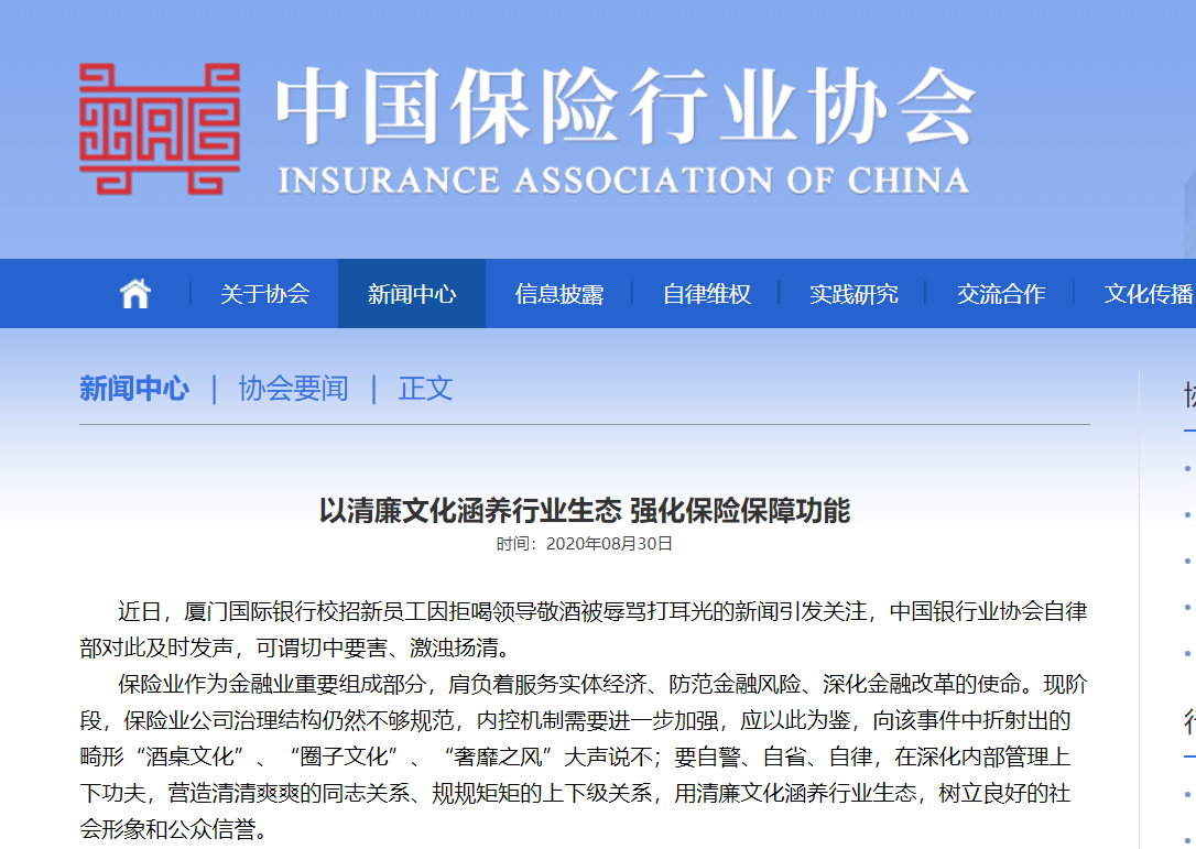 2020年8月30日,近日,厦门国际银行校招新员工因拒喝领导敬酒被辱骂打耳光的新闻引发关注,中国银行业协会自律部对此及时发声,可谓切中要害、激浊扬清。