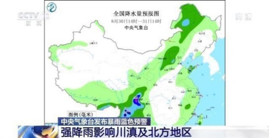 今天(8月30日),我国强降雨重心依然集中在四川、云南一带,同时,北方多地也有明显降雨,中央气象台继续发布暴雨蓝色预警。