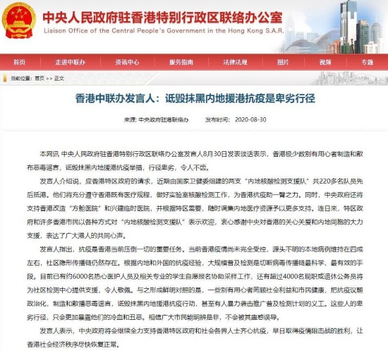 中央人民政府驻香港特别行政区联络办公室发言人8月30日发表谈话表示,香港极少数别有用心者制造和散布恶毒谣言,诋毁抹黑内地援港抗疫举措,行径卑劣,令人不齿。