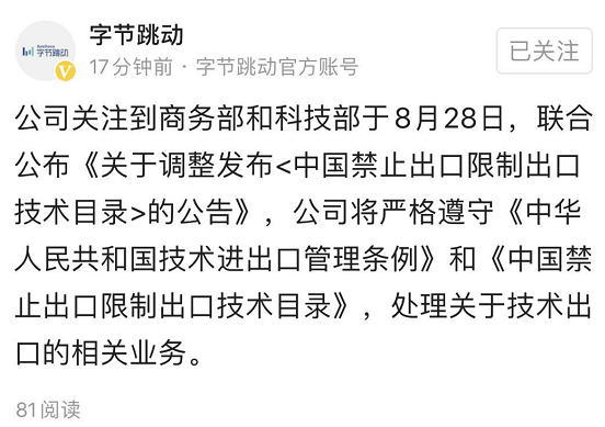 字节跳动:将严格遵守国家禁止出口、限制出口技术目录相关要求