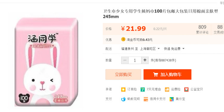 “涵同学卫生巾批发生活馆”淘宝店中,“散装”的产品描述已被撤下。点击被微博热议的那张“没有品牌、没有生产商和生产日期”的透明大包装卫生巾图片,可跳转到购买页面,显示的卫生巾包装图片带有“涵同学”logo和卡通兔子,标注为100片。