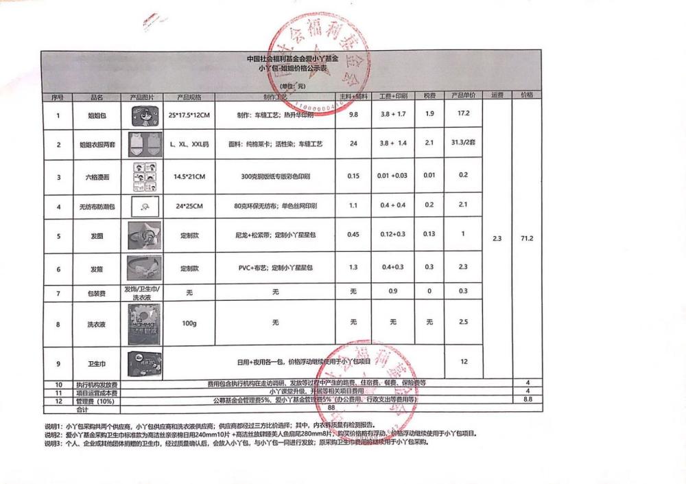 爱小丫基金“小丫包”价格公示。(腾讯公益“爱小丫基金”财务公示/图)