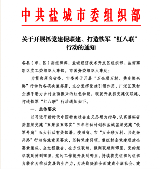 全省“万企联万村、共走振兴路”行动开展以来,盐城市委组织部认真落实省委组织部抓党建促联建部署要求,组织开展宣传联动、组织联盟、队伍联建、活动联办、人才联育、资源联享、发展联促、典型联树等系列行动,着力打造盐城铁军“红八联”,集聚村企携手助力乡村振兴红色动能,持续将党组织的组织力转化为推动发展的生产力。截至8月上旬,全市已有721家企业与898个村开展联建,联建项目509个,联建党组织333个,在项目、产业链、新型业态上建立党组织166个。