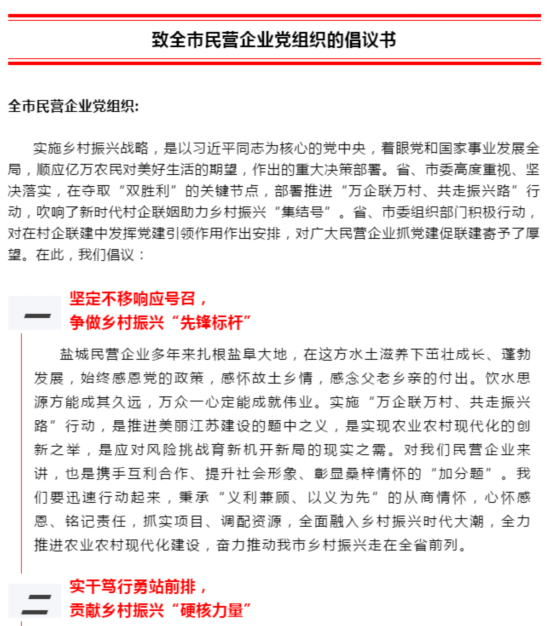 融合并进共下联建“一盘棋”。注重将抓党建促联建与落实省基层党建“五聚焦五落实”30项重点任务相结合,与深化盐城基层党建“12345”推进体系、打造“铁军号角”品牌相结合,与抓牢抓实农村带头人队伍建设、推进“两新”组织拓面提质相结合,在融常融长中抓好各项重点任务落实。通过基层党组织统一活动日、主题党日等平台载体,推动各地结合实际开展组团服务“美丽乡村行”等活动,引导村企党组织双向互动,在组织架构、活动开展等方面融合共建,提高村企联建质量。深入挖掘盐城铁军文化资源,集成各地党员讲师下基层、共产党员“你我他”微纪实、村党组织集体增收创业大赛等优质党建资源,积极创新党建共建形式,凝集联建工作合力。全市村企已累计选派党建工作联络员500多人,联建党员先锋队、志愿服务队550多个,开展互上党课、联合主题党日等活动400多次,村企互派挂职学习人员900多人,村聘用顾问和职业经理人数300多人。建湖县沿河镇新丰村党总支与江苏振华工业集团党委签订村企合作协议,建立长期稳定的职业技能培训、就业合作关系,形成了以带强班子、带出思路、带动发展、带办实事为内容的村企共建“振华模式”。
