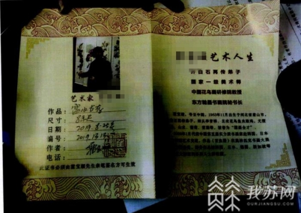 买完画后,“大师”给了李先生一张收藏证书,并在上面签名盖章,表示有了这个收藏证书,以后如果想要拍卖,是不需要经过鉴定的,会省去很多麻烦。李先生一家与“大师”合影留念,“大师”将他们送到楼下后,继续回楼上作画。