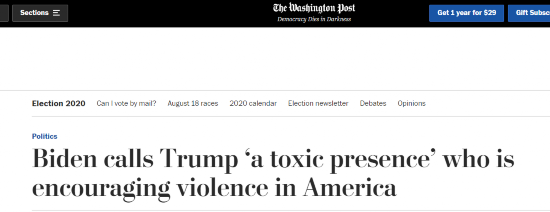 “4年来,唐纳德·特朗普在我们国家一直是一个有毒的存在,我们能摆脱这种毒素吗?”当地时间8月31日,美国民主党总统候选人拜登发表竞选演讲,再次谴责美国近期的暴力示威活动,并炮轰美国总统特朗普煽动暴力,让所有美国人陷入危险,是“有毒的存在”。