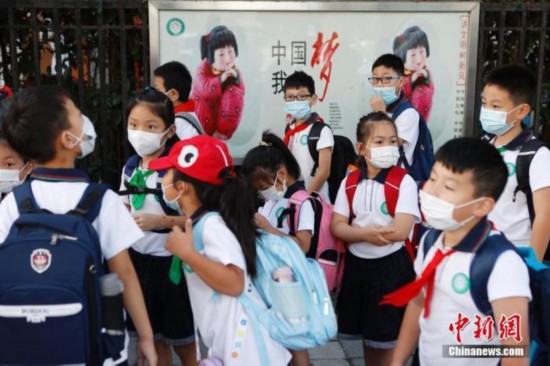 9月1日,小学生戴着口罩排队等待进入学校。中新社记者 殷立勤 摄