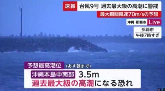 强台风“美莎克”逼近日本冲绳县,给当地带来狂风暴雨天气。(图片来源:日本富士电视台视频截图)