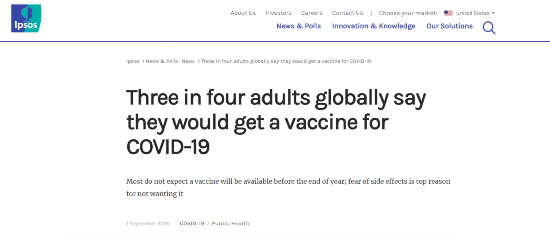 疫苗面市后是否愿意接种?是否相信自己能在2020年年底获得新冠疫苗?益普索8月31日发布的最新民调就上述问题进行了调查并给出了一些答案。民调结果显示,全球74%的受访者表示愿意在新冠疫苗面市后接种,不过仅有41%的受访者相信自己能在2020年年底之前获得新冠疫苗。值得注意的是,中国受访者在上述两问题上的表现均高于全球平均水平,数值分别为97%和87%。两项数值均系参与调查的27国各自在这两项指标上的最高水平。
