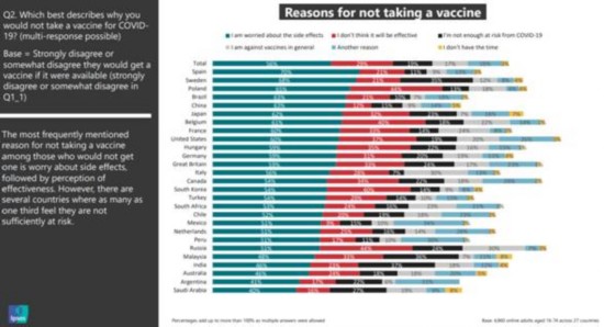 值得注意的是,来自中国的受访者中,97%的人表示愿意在疫苗面市后接种疫苗,这一比例位居27国之首。益普索用“突出”(stand-out)来形容中国受访者的乐观表现。除中国外,巴西、澳大利亚、印度的受访者在这一问题上也表现得较为积极,在27国中分别位列第二、三、四位。而美国受访者表示愿意在疫苗面世后接种的比例为67%。