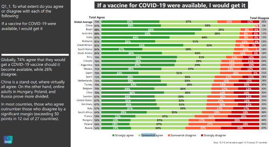 相比之下,德国、比利时、日本和波兰的受访者则持怀疑态度。在这些国家,仅有不到四分之一的受访者同意“我能在2020年年底获得新冠疫苗”这一观点,而美国也仅有34%的受访者表示同意。