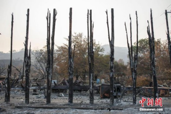 当地时间8月28日,美国北加州瓦卡维尔一处建筑物被山火损毁。当地媒体报道称,湾区受灾严重的社区将面临漫长的重建过程。 中新社记者 刘关关 摄