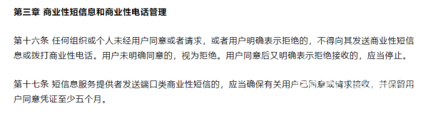 8月31日,工业和信息化部对外发布《通信短信息和语音呼叫服务管理规定(征求意见稿)》,其中第十六条明确规定"任何组织或个人未经用户同意或者请求,或者用户明确表示拒绝的,不得向其发送商业性短信息或拨打商业性电话。用户未明确同意的,视为拒绝。"