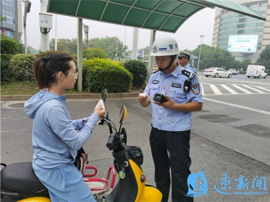 “您好!因为您驾驶电动自行车,未佩戴安全头盔,按照驾乘电动自行车‘新规’,首次罚款20元!”9月1日早晨7点10分,在宿迁市区洪泽湖路与世纪大道交叉路口,宿迁市公安局交警支队民警钟岳向市民袁女士宣读了处罚决定。这也是宿迁市驾乘电动自行车“新规”9月1日实施后,开出的首张罚单。