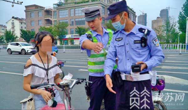 “请你停下一下,你的头盔呢?”沭阳交警一中队民警王浩冉在苏州路与上海路交叉路口执勤,拦下了“第一位”被发现未佩戴安全头盔上路的女士。