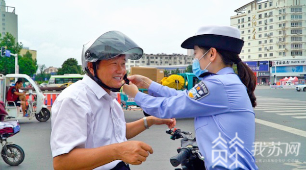 “大爷,你看你这头盔下面的带子都没系好,这要出现紧急情况头盔不就飞出去了吗?哪还有防护功能?”沭阳交警钱雪在执勤过程中发现一位市民的头盔完全没有固定住,于是上前劝导并帮其戴好。