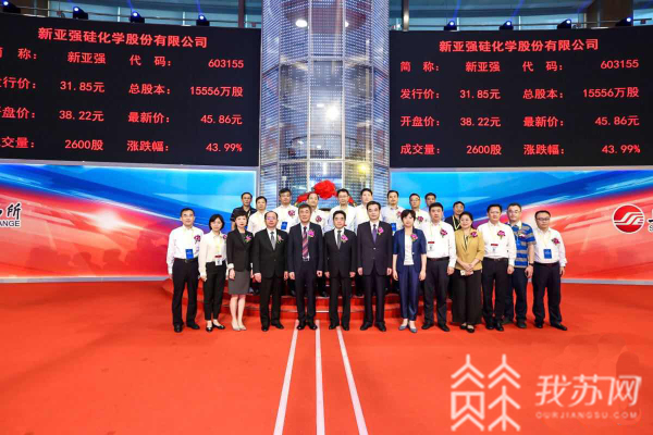 我苏网讯 9月1日上午,伴随着六声清脆的开市钟响,新亚强硅化学股份有限公司在上海证券交易所隆重上市,正式成为宿迁第一家A股主板上市企业、也是宿迁第五家主板上市企业。