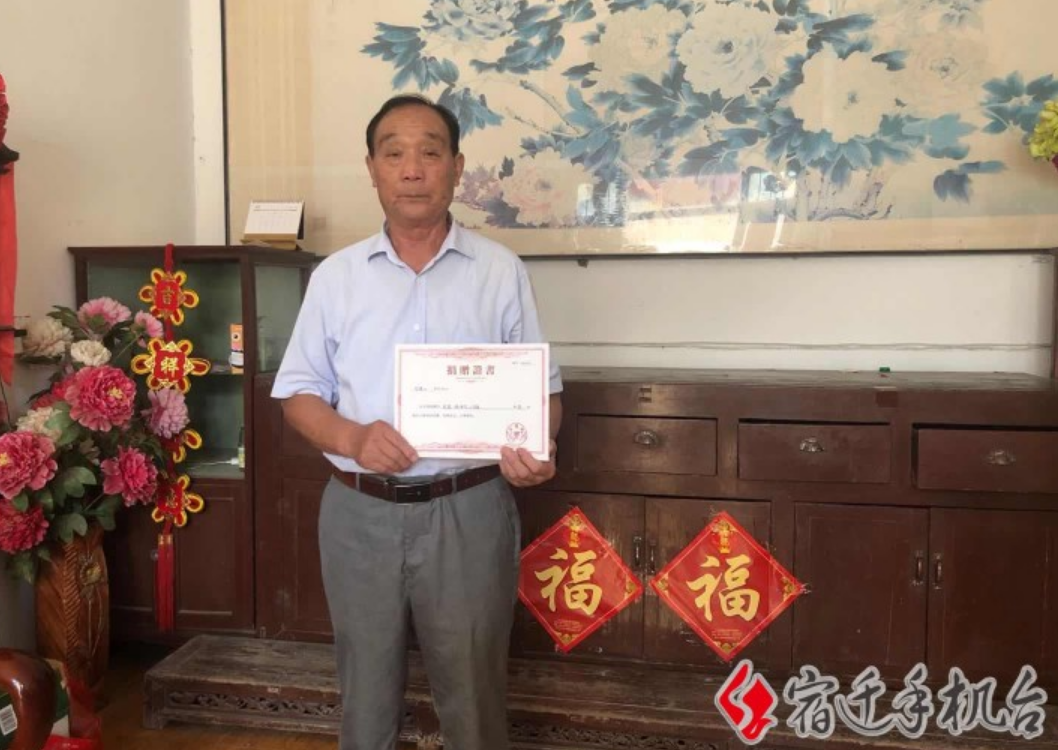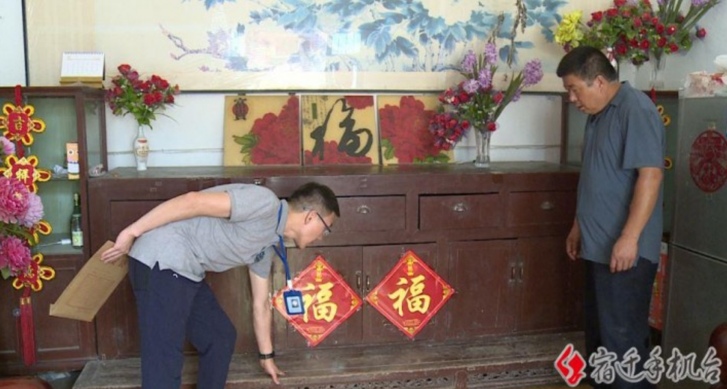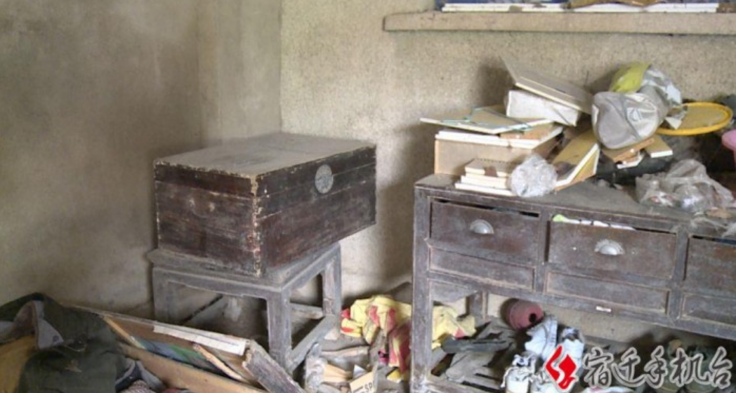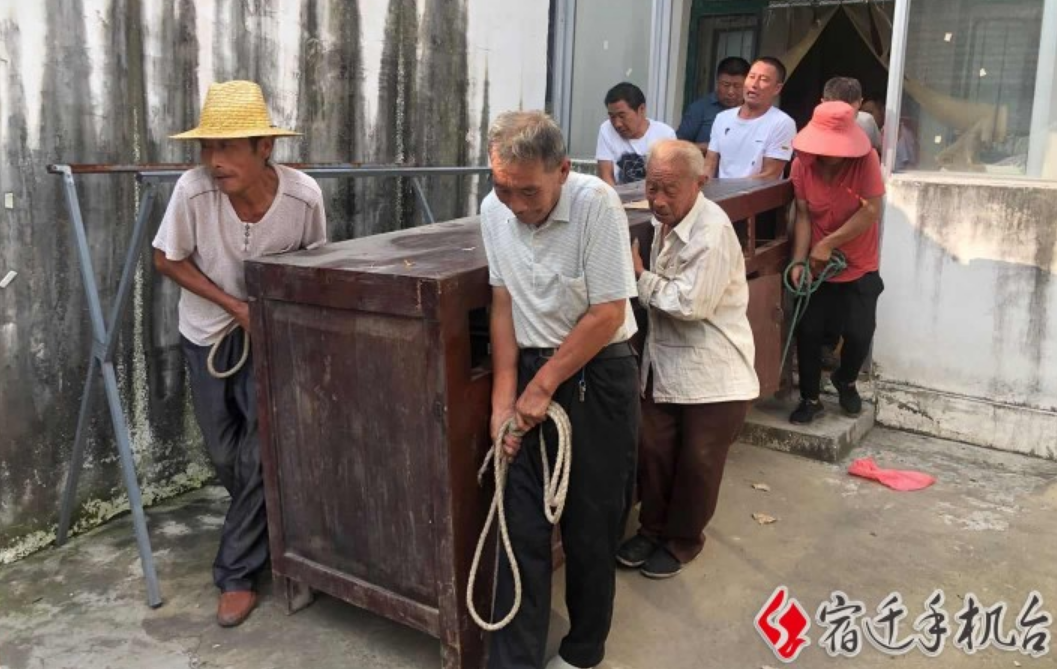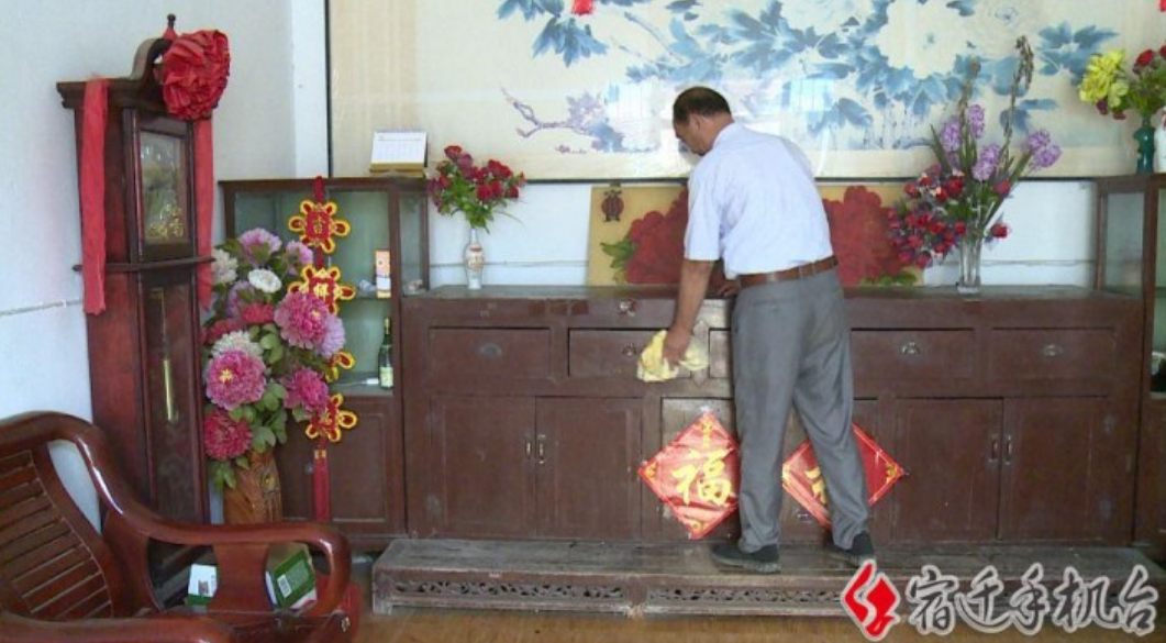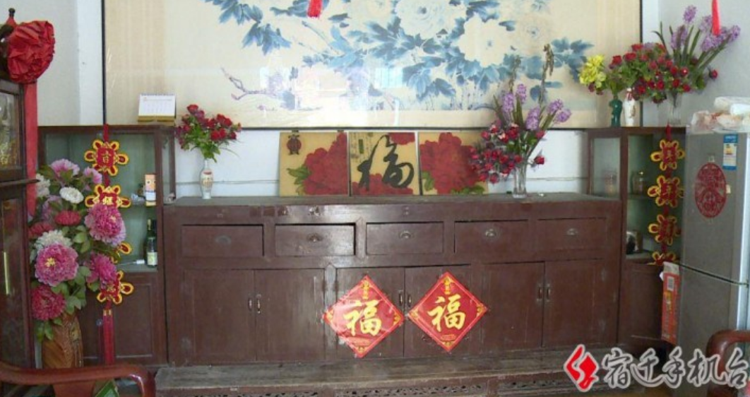 在宿豫区顺河街道梨园湾社区邓德仁家的堂屋,记者看到了这个老式贡柜,长度有2.6米,紫红色的漆面,柜面上摆放着鲜花,斑驳的把手可以看出贡柜历经的岁月痕迹。