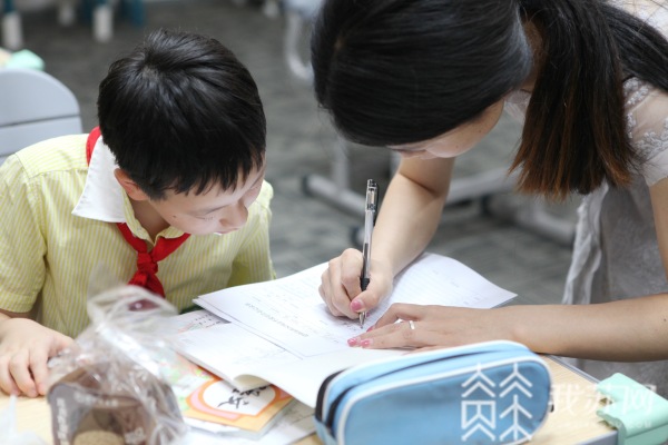 落座前,家长和孩子需要测量体温、登记姓名和具体接送时间,同时领到一张作业记录单,分为语文、数学各科目,填上当晚所需完成的各项作业后,将由托管班老师帮助指导孩子一样样完成,并在记录单后给予评分,力争达到“一对一”辅导效果。