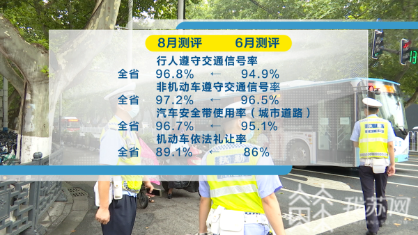测评指标包括“机动车依法礼让率”“行人及非机动车遵守交通信号率”“电动自行车挂牌率、头盔佩戴率”以及“汽车的安全带使用率”等6个项目。