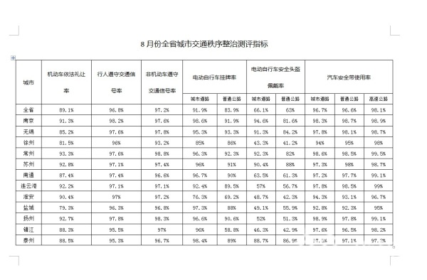 9月2日,有一份事关各个城市交通秩序的成绩单新鲜出炉。江苏省公安厅交警总队的民警从5月份开始,每个月为13个设区市的交通秩序文明指数“打分”。