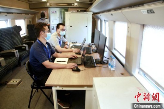 图为工作人员在DJ1101次综合检测车上监测数据。张远 摄