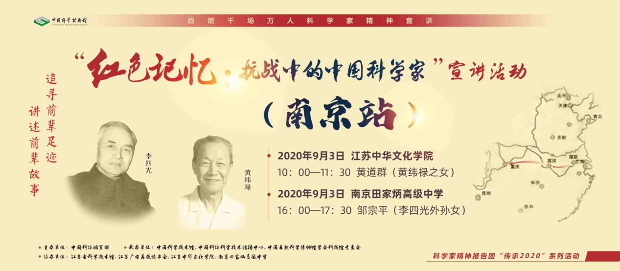 9月3日,由中国科协调宣部主办,中国科学技术馆、中国科协科学技术传播中心、中国自然科学博物馆学会科技馆专委会承办,江苏科技馆、江苏广电总台荔枝读书会和优漫卡通卫视协办的“红色记忆:抗战中的中国科学家”科学家精神报告团“传承2020” 大型宣讲活动暨中国科技馆“百馆千场万人”科学家精神宣讲活动南京专场成功举办,江苏中华文化学院、南京田家炳高级中学、南京师范大学附属中学、金陵中学河西分校的师生代表和干部职工共计2000余人一起聆听报告。