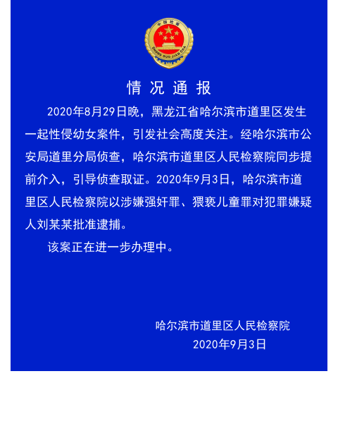 荔枝新闻讯 据哈尔滨市道里区人民检察院官方微信“道里检察”9月3日通报,哈尔滨“性侵5岁幼女案”嫌犯刘某某涉嫌强奸罪、猥亵儿童罪被批捕。