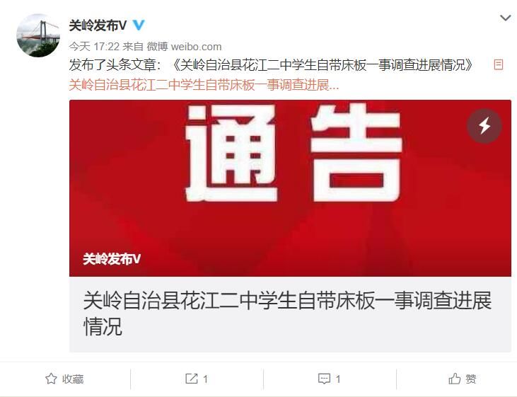 荔枝新闻讯 中共关岭布依族苗族自治县委宣传部官方微博@关岭发布V 9月3日发布关岭自治县花江二中学生自带床板一事调查进展情况。 全文如下: